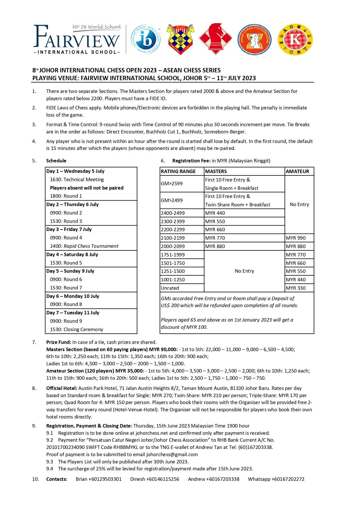 The official hotel for the Johor Open is the Austin Park Hotel, as changed from the original prospectus from Berjaya Waterfront Hotel. The first 20 GMs above a certain rating will receive free entry and accommodation with breakfast! Those who book the hotel directly with the organizer will be provided free 2-way transfers for every round (hotel-venue-hotel).
