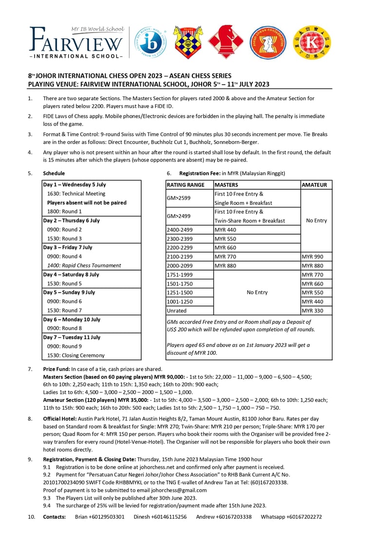 The 8th Johor International Chess Open will take place from 5th to 11th July at Fairview International School. The tournament has a total prize fund of RM135,000 which includes the classical & rapid tournaments.